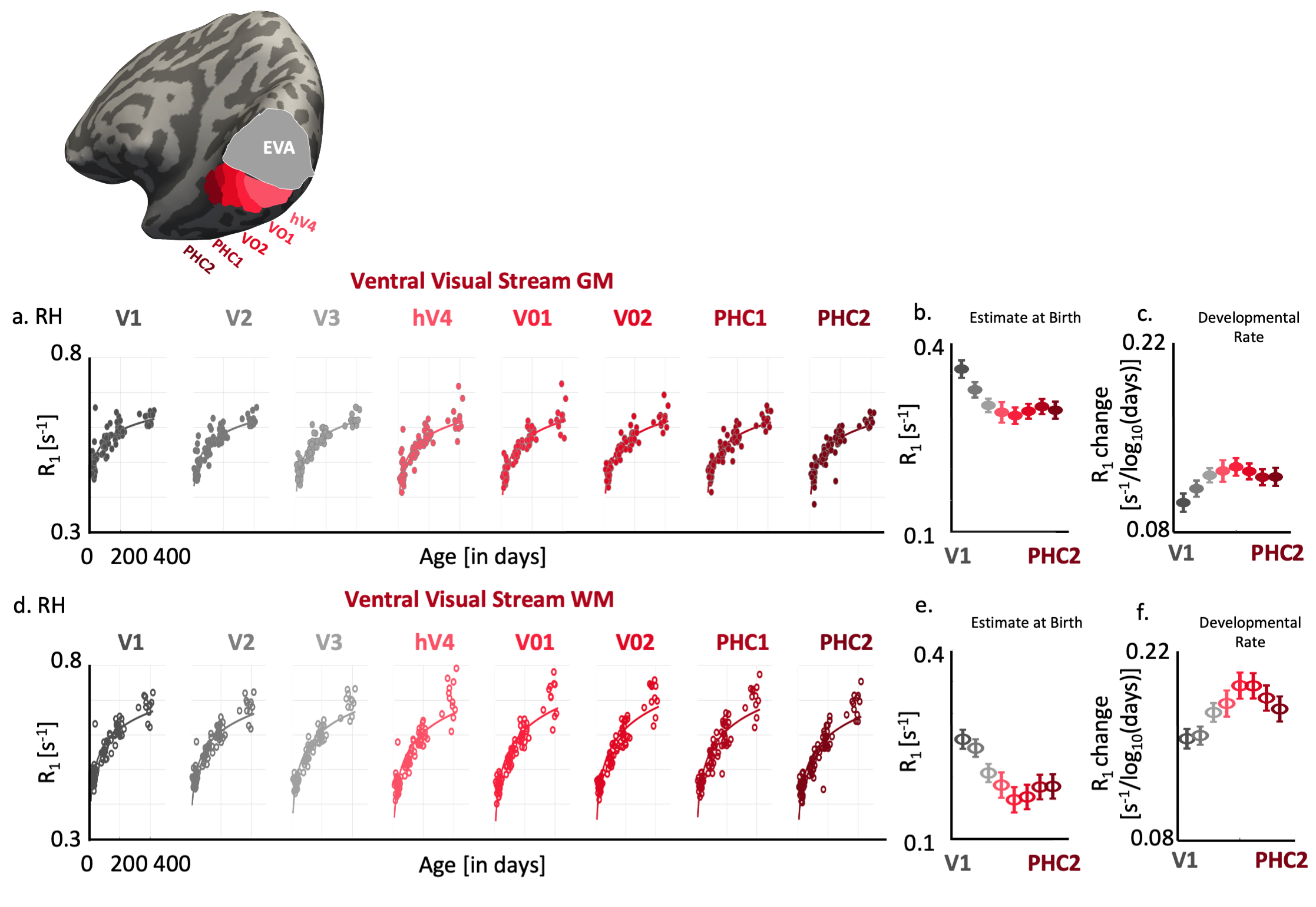 Want to learn how microstructural tissue properties develop in the visual cortex during the first year of human life? Our new study shows that microstructure in the gray matter and the adjacent white matter of brain regions across the dorsal, lateral, and ventral visual processing streams becomes denser after birth. This pattern indicates substantial tissue growth in the brain following an infant’s birth. Within each stream, early visual areas appear more mature at birth than higher-level areas, yet they show slower postnatal development compared with those higher-level areas. This hierarchical organization may be a core feature of the visual system as newer processes build on and refine older ones. We hypothesize that if microstructural maturation is tied to functional specialization, that functional development may follow a similar hierarchical course.