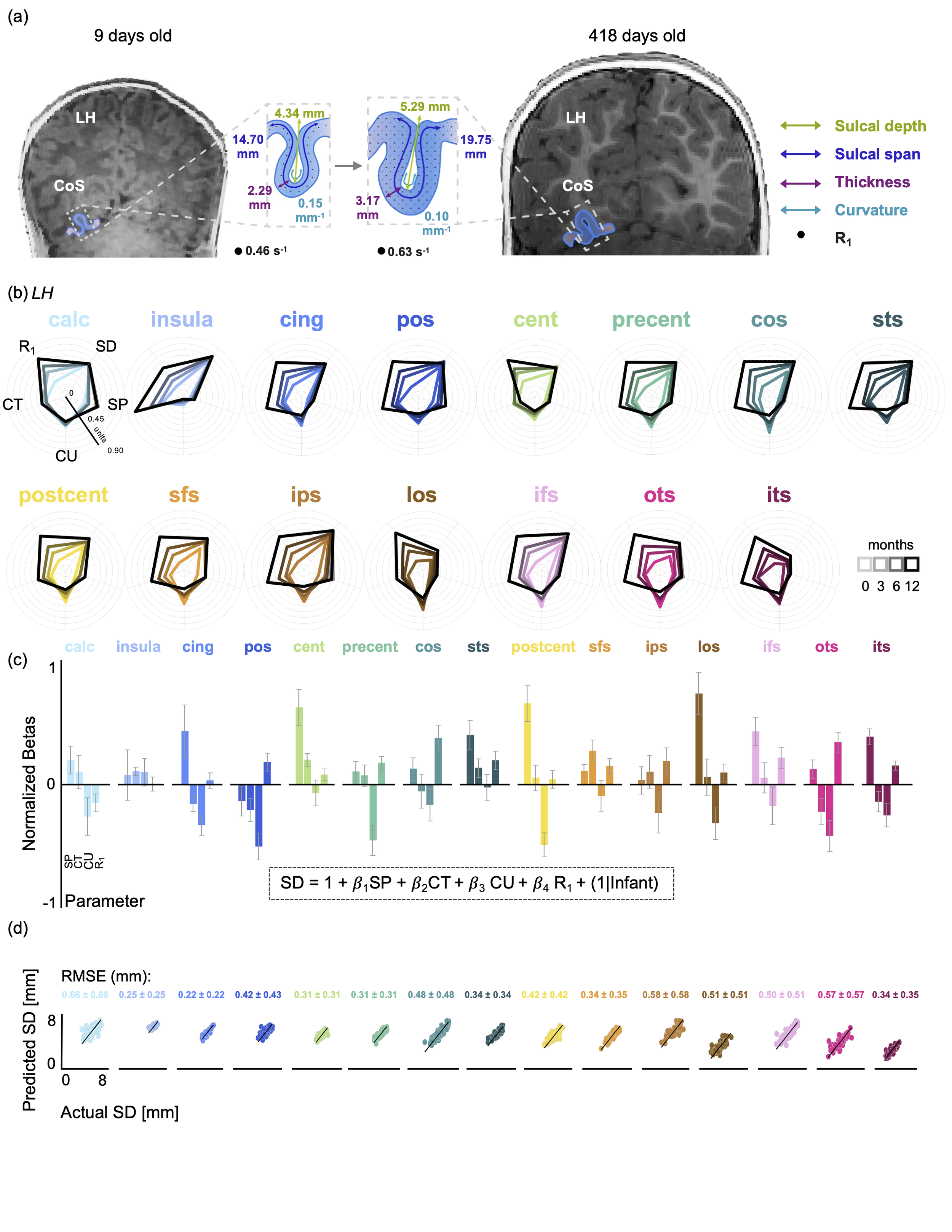 Brain folds begin to form in the womb and deepen substantially throughout the first year of human life. In a new study we find that folds which emerge earlier in gestation—during roughly the 16th to 19th gestational weeks, such as the calcarine sulcus—are already relatively deep at birth and then show little to no additional deepening over the first postnatal year. By contrast, sulci that appear later in utero tend to deepen more rapidly after birth than those that formed earlier. This postnatal sulcal deepening reflects a complex, multicomponent process involving coordinated morphological changes and underlying microstructural development.
